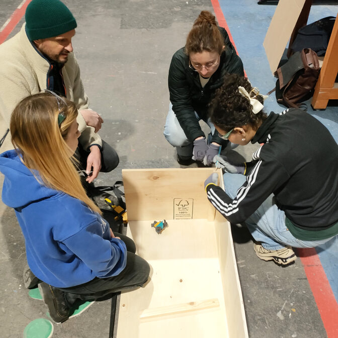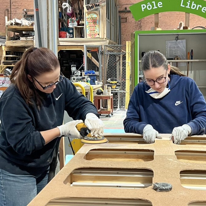 La singularité de la démarche repose sur l’articulation étroite entre conception et construction. Après une première semaine dédiée à la conception et à l’élaboration de scénarios d’usage, les étudiants ont conçu des dispositifs pensés pour être appropriables, adaptables et faciles à reproduire. La seconde phase, menée à la Halle C de la Condition Publique, a permis de prototyper ces dispositifs à l’échelle 1, confrontant les intentions de projet à la réalité du faire.
