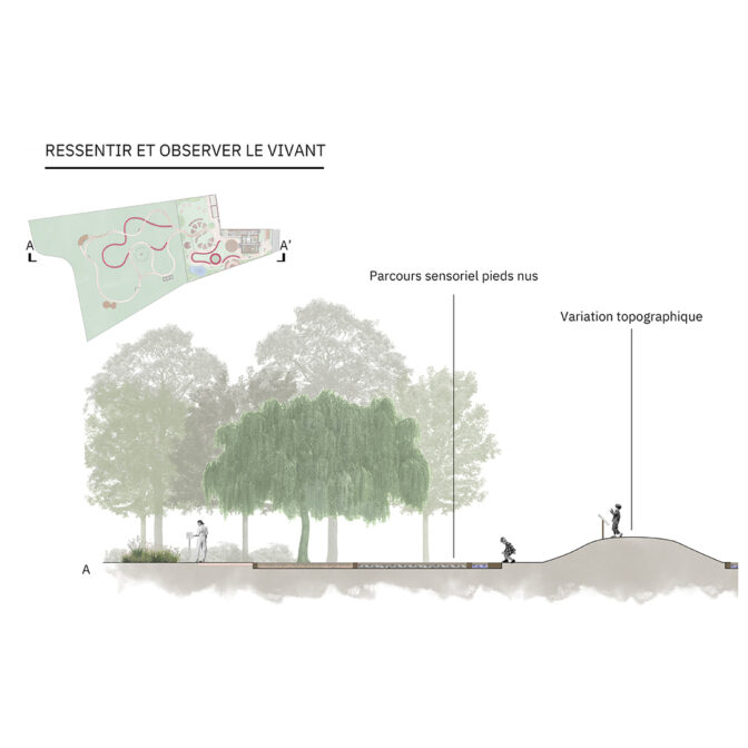 S’inscrivant dans la continuité de la concertation citoyenne menée par la ville et de l’étude de faisabilité pilotée par la Fabrique des quartiers, les étudiants ont été invités à analyser le site, comprendre les besoins formulés et proposer des intentions d’aménagement articulant usages pédagogiques, activités culturelles et sensibilisation à la biodiversité. A l’issue d’une phase d’esquisses individuelle, la Ville a sélectionné quatre propositions. Ces dernières ont été développées en équipe jusqu’au stade de l’avant-projet.