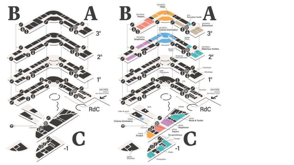 Les plans simplifiés de l’école sont disponibles ici (format PDF éditables avec Adobe Illustrator). Pour des versions plus précises, faire une demande au DDFPT.